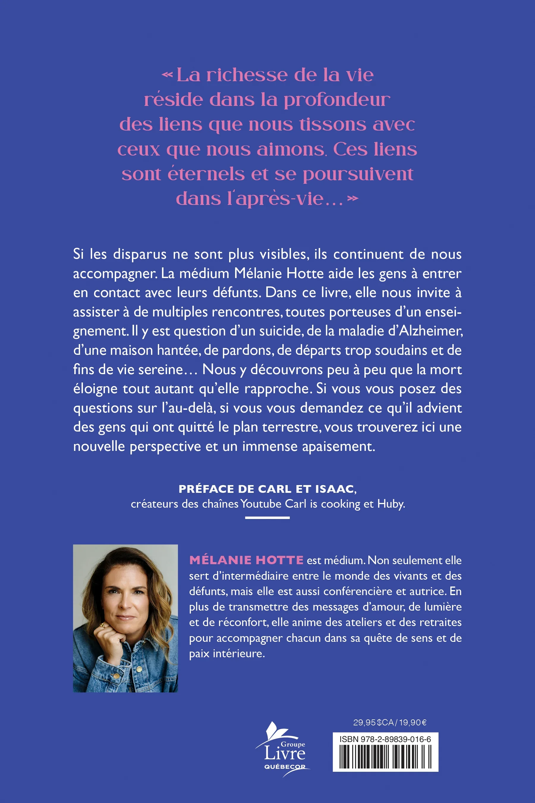 Si les disparus ne sont plus visibles, ils continuent de nous accompagner. La médium Mélanie Hotte aide les gens à entrer en contact avec leurs défunts. Dans ce livre, elle nous invite à assister à de multiples rencontres, toutes porteuses d’un enseignement. Il y est question d’un suicide, de la maladie d’Alzheimer, d’une maison hantée, de pardons, de départs trop soudains et de fins de vie sereine… Nous y découvrons peu à peu que la mort éloigne tout autant qu’elle rapproche.